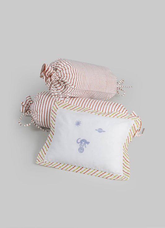 Transform your space with Viya's playful fabric cushion set, featuring whimsical space motifs and contemporary stripe patterns. Complimentary shipping in India.