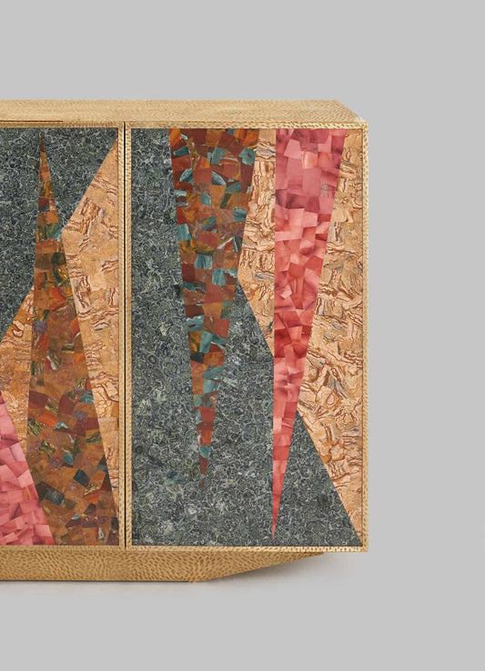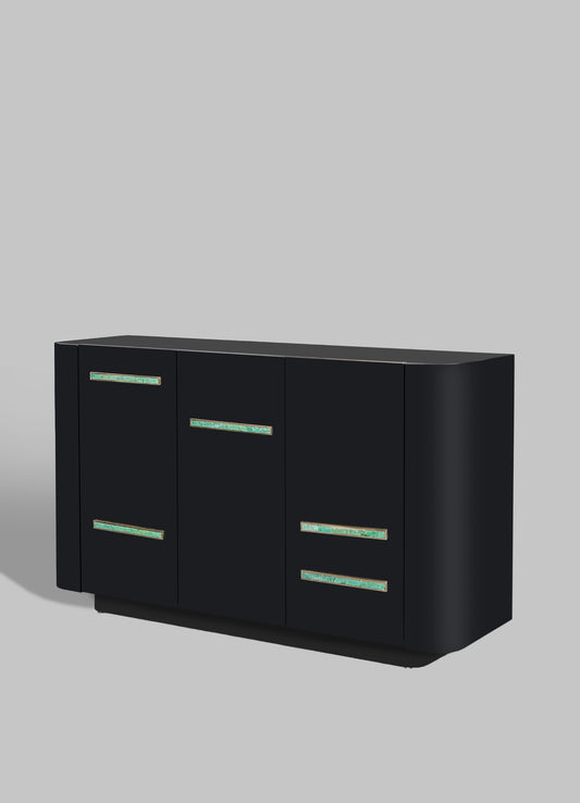 Viya’s custom cabinets blend walnut and jade hues for a modern luxury aesthetic, ideal for contemporary kitchens and bathrooms.