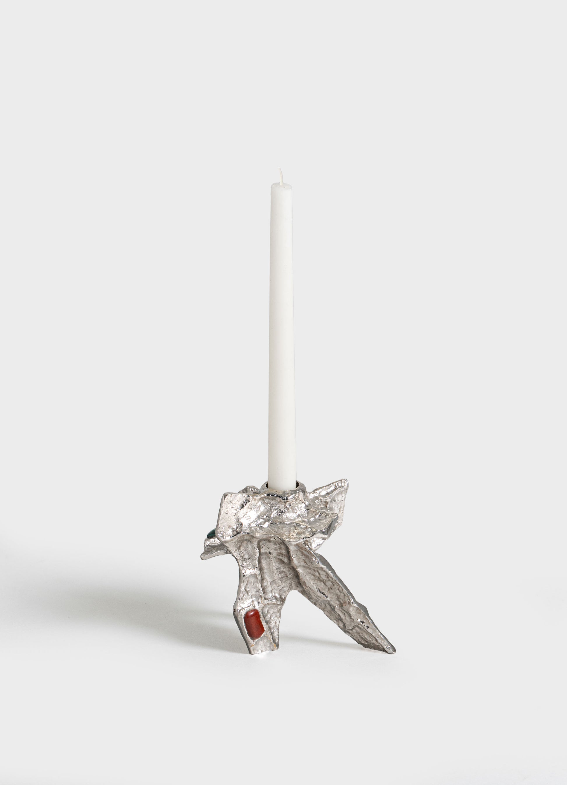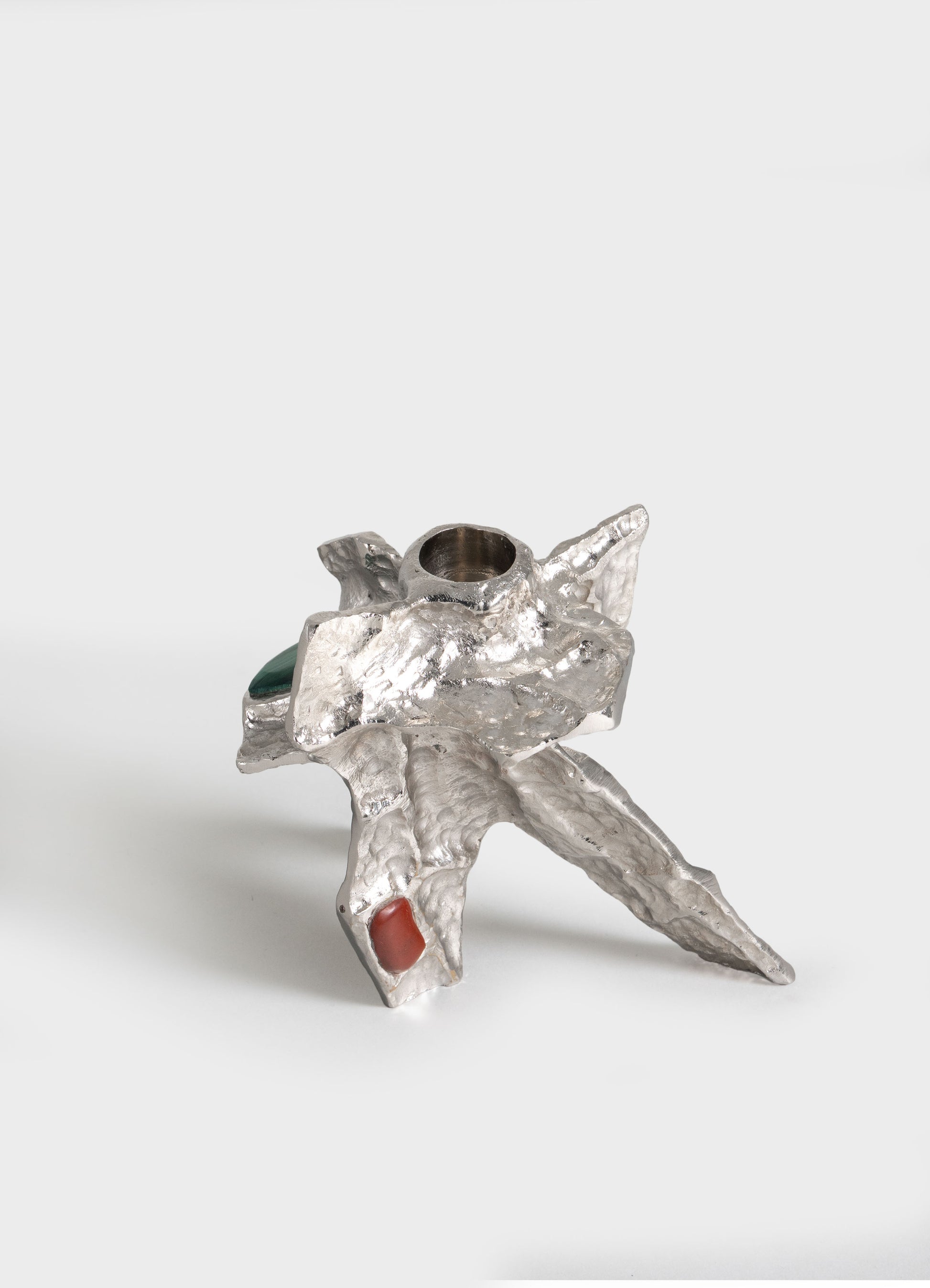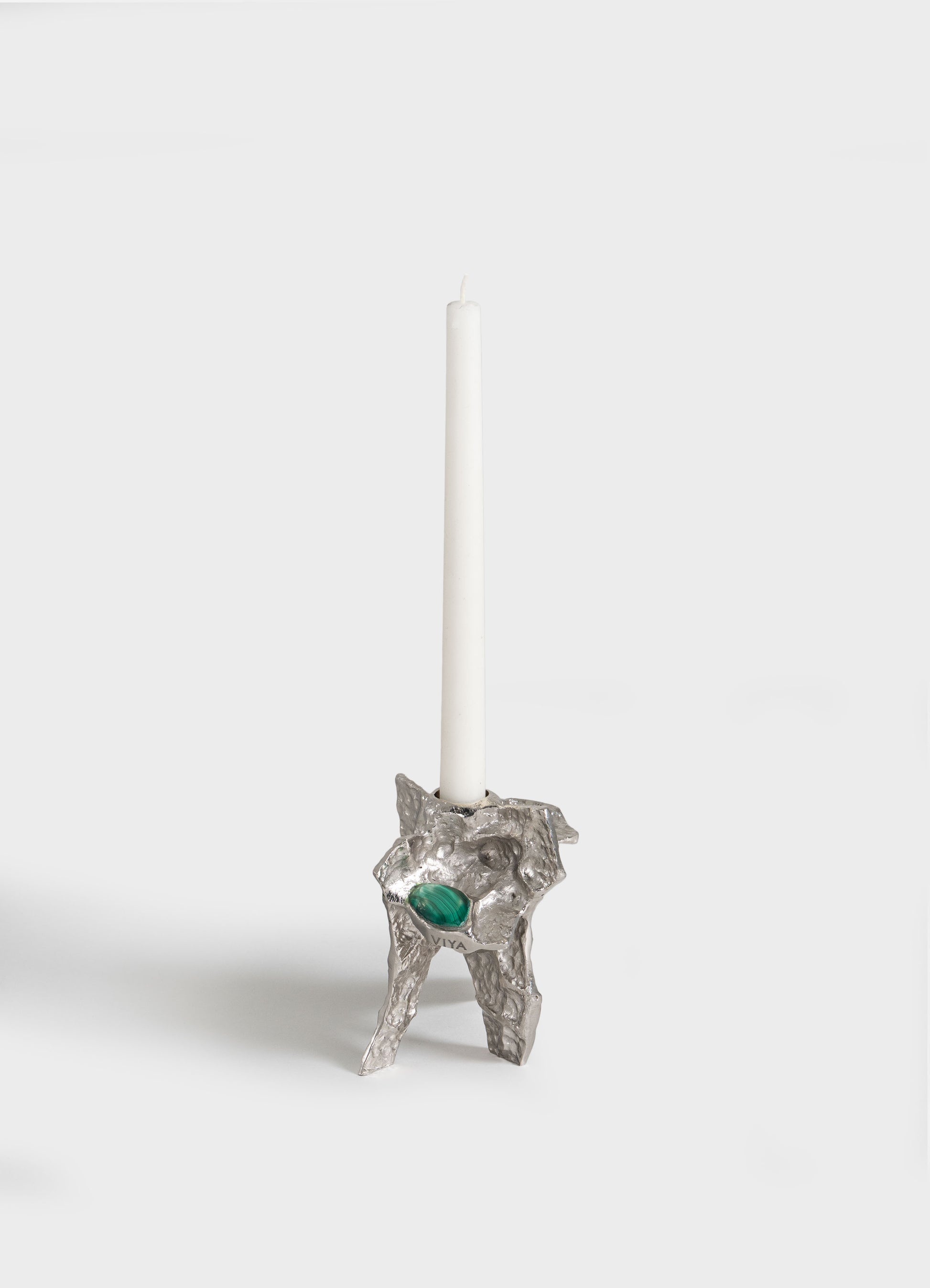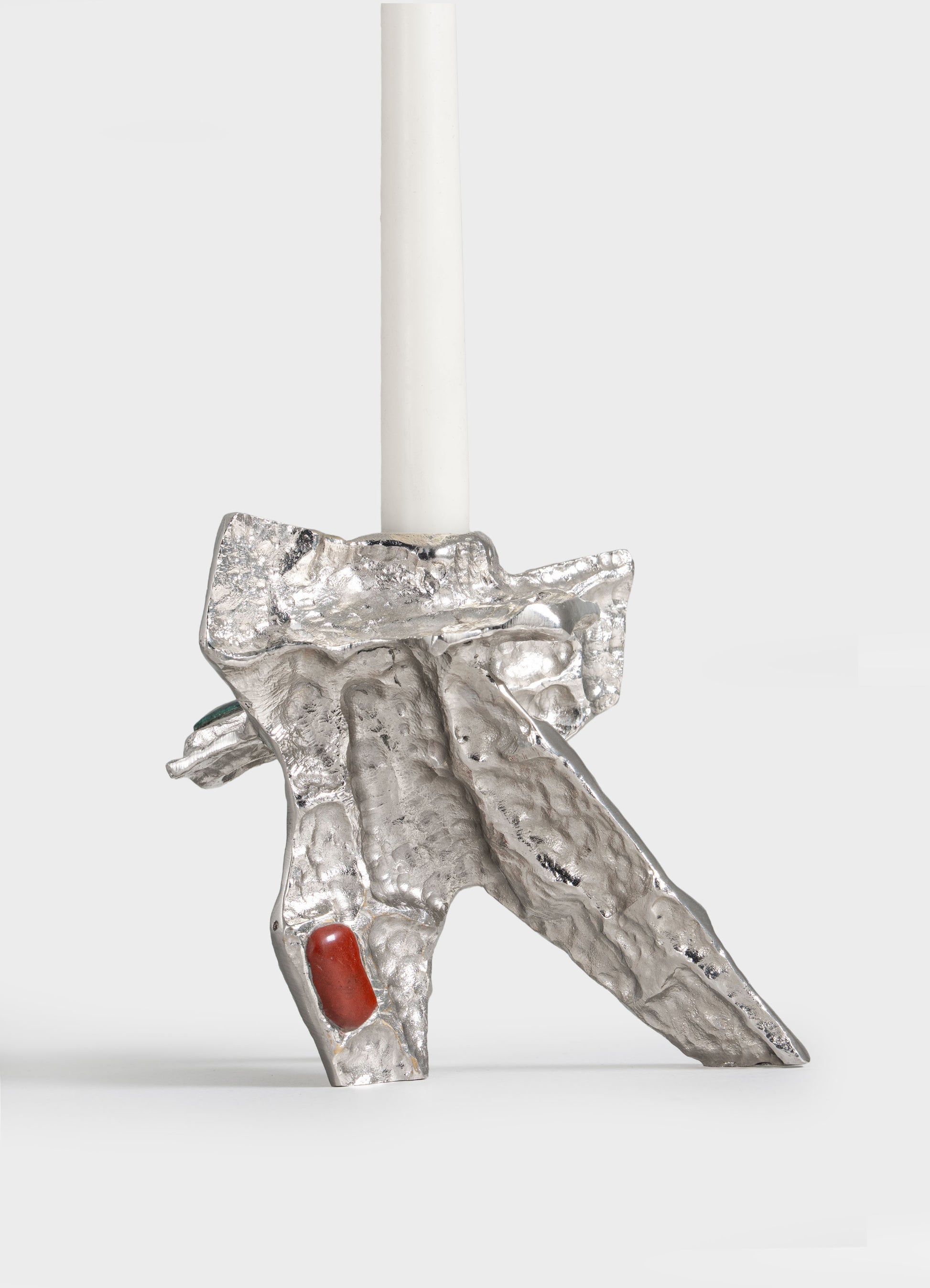 حامل شموع من النحاس والنيكل مع زخارف شبه كريمة. صنع يدويًا في الهند.