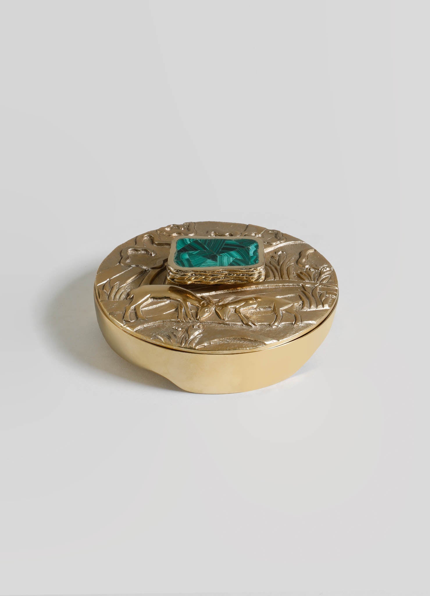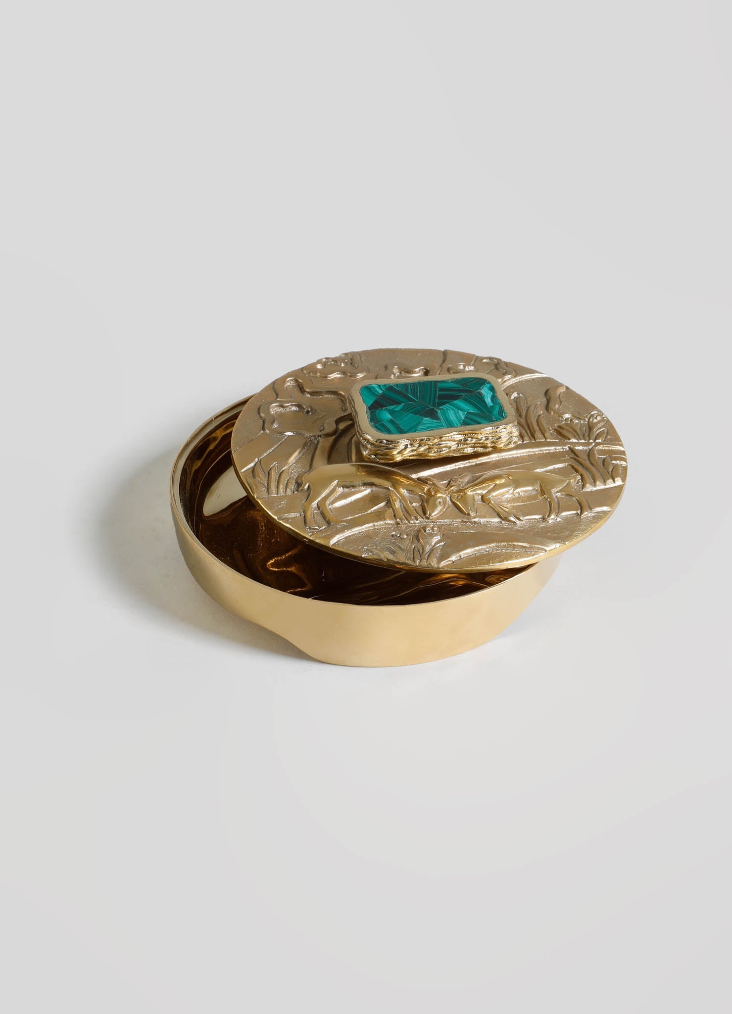 صندوق تحف من النحاس مع زخارف شبه ثمينة. صنع يدويًا في الهند.