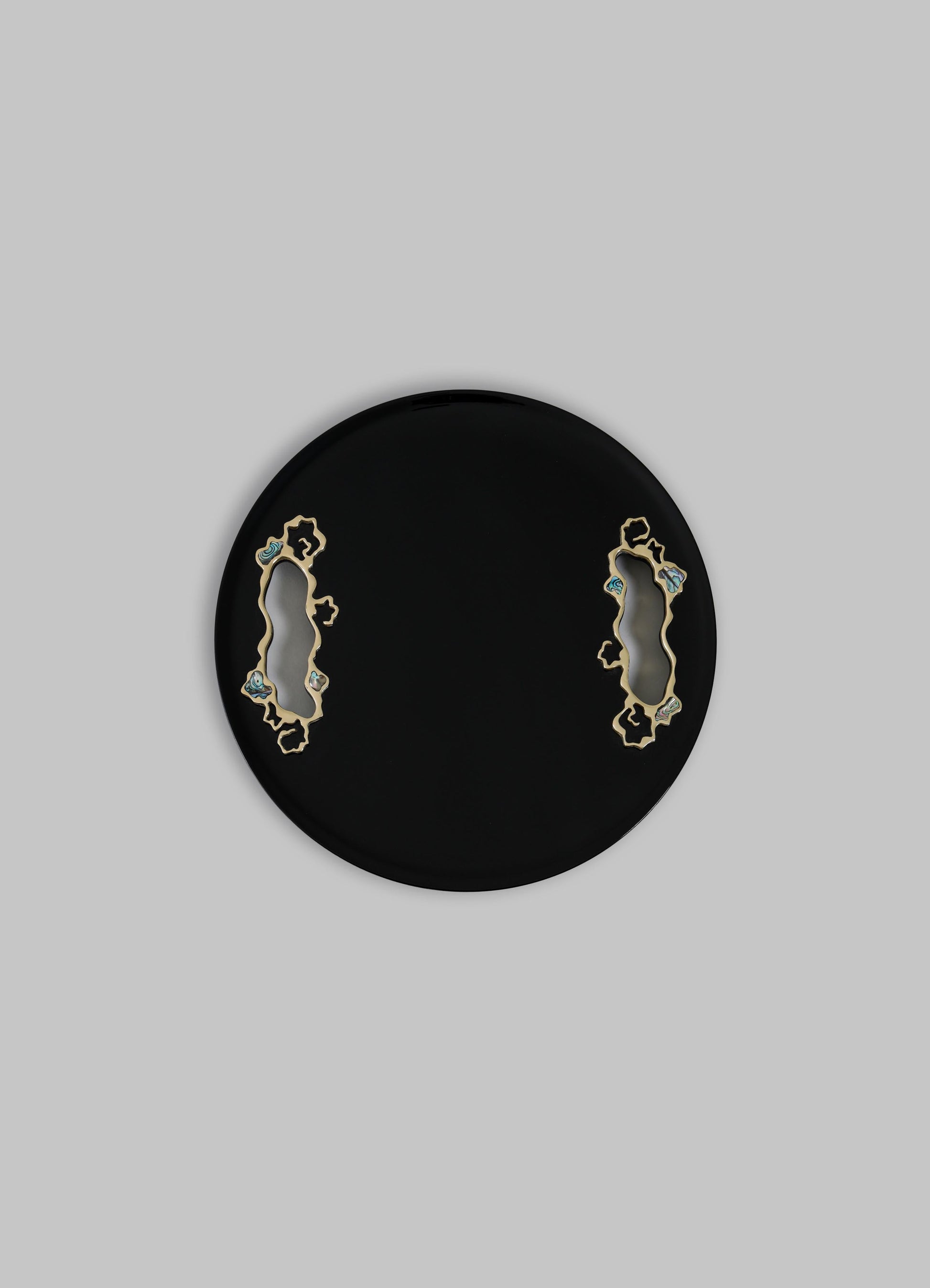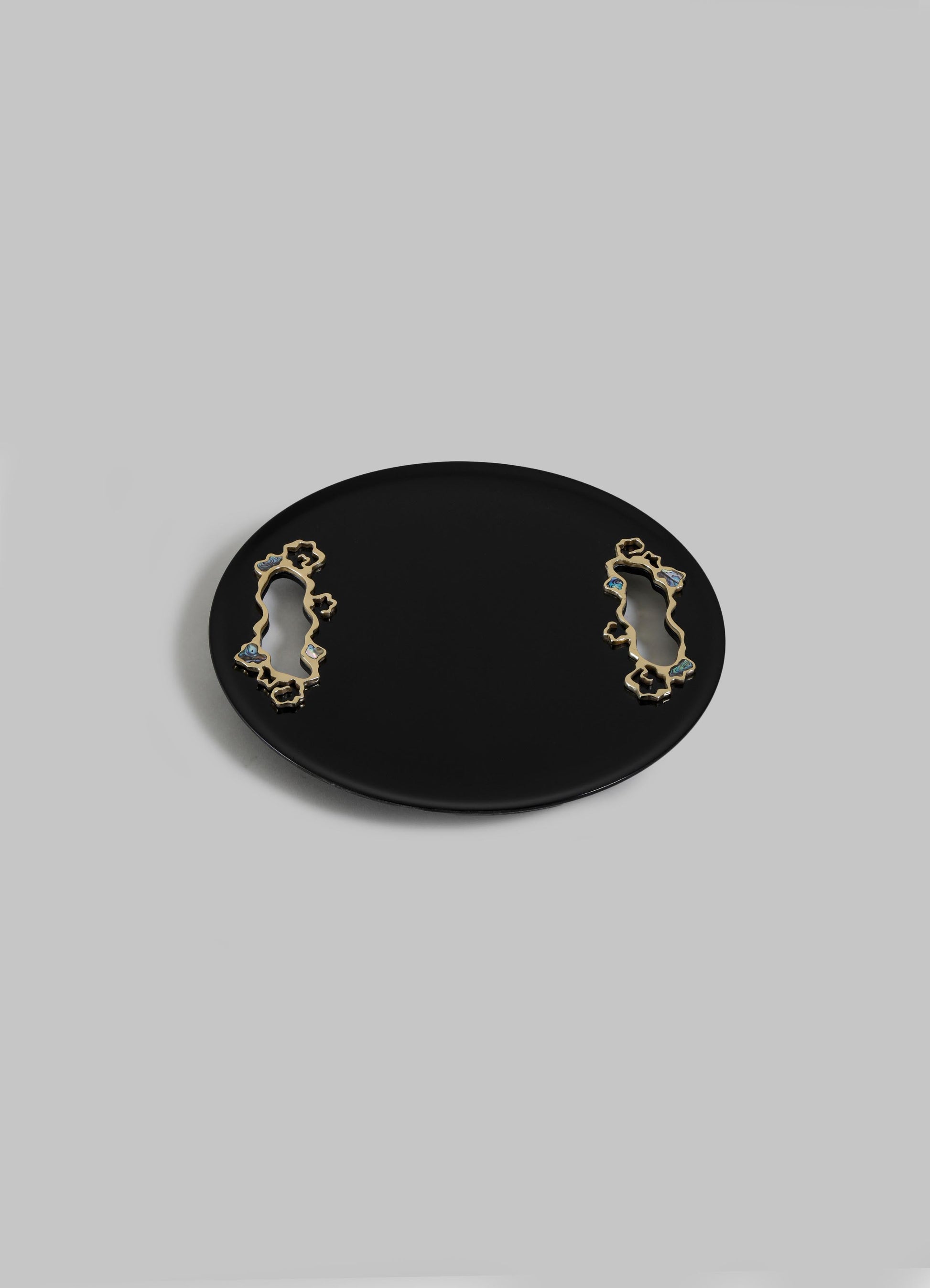 صينية مطلية بالورنيش مع لمسات من النحاس وشبه الكريمة. مصنوعة يدويًا في الهند.