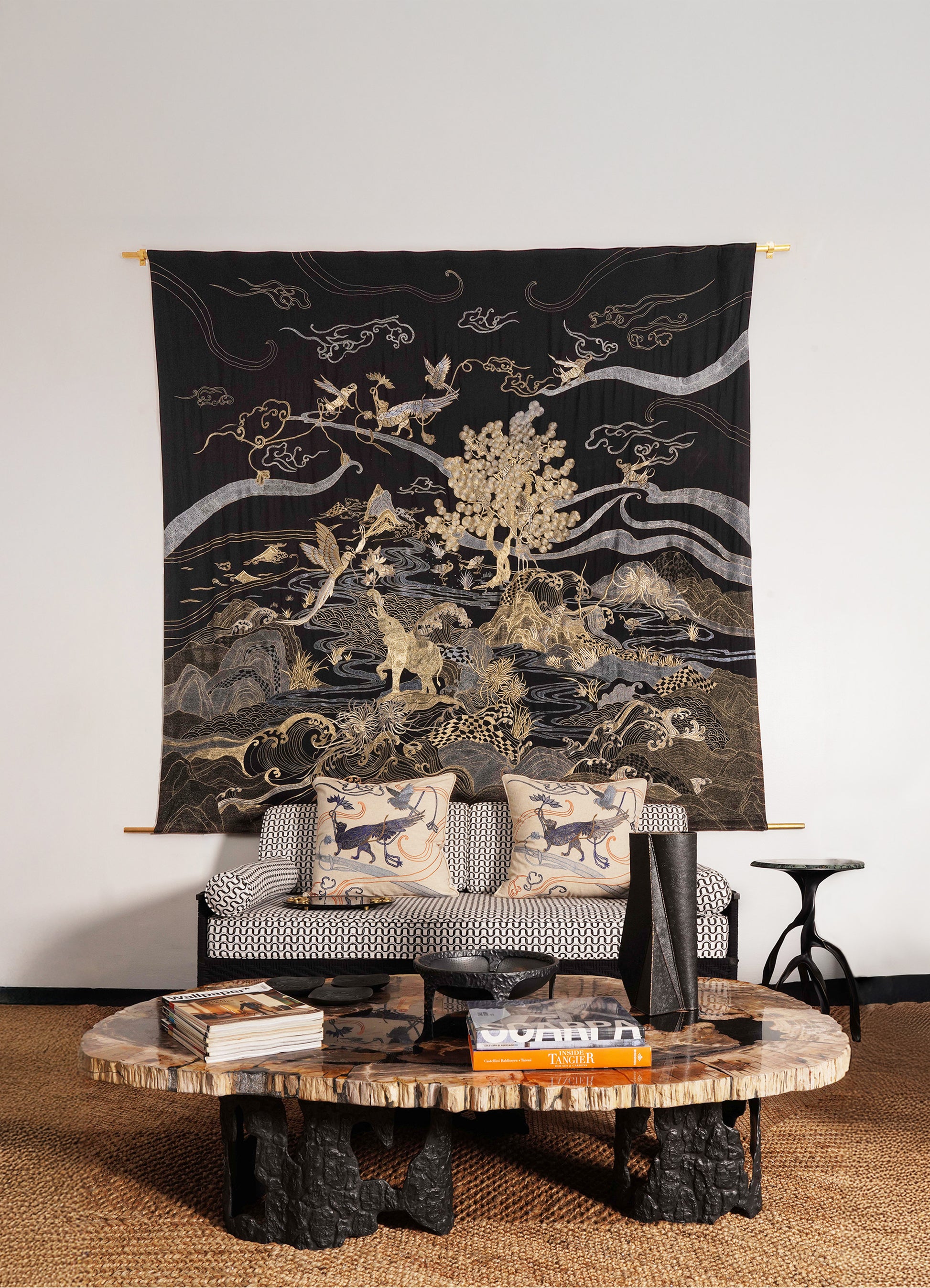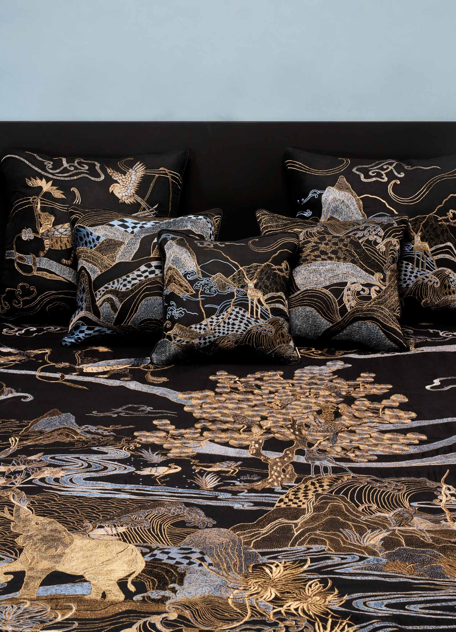 Contempla la encarnación tangible de un sueño: una colección caprichosa de textiles inspirados en el manuscrito rajput del siglo XVII, "El Libro de los Sueños". Estos textiles bordados dan vida a motivos simbólicos cargados de bendiciones auspiciosas, desde el poderoso Gajaraja, Rey Elefante, y el mítico Gajasimha, León Elefante, hasta el árbol auspicioso lleno de loros alados y el majestuoso antílope Blackbuck. Cada pieza lleva una promesa innata de buena fortuna, invitando al usuario a participar en un viaje a través del reino de los sueños y la sabiduría ancestral.
